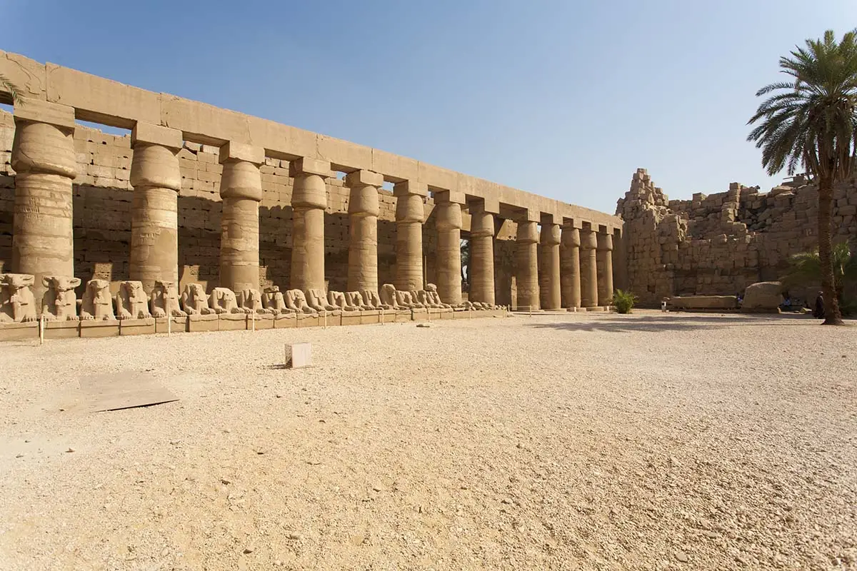 Collega Karnak tramite l’antico “Viale delle Sfingi”. Al tramonto diventa un luogo magico, illuminato da luci calde che mettono in risalto le statue colossali di Ramses II e le sale interne.